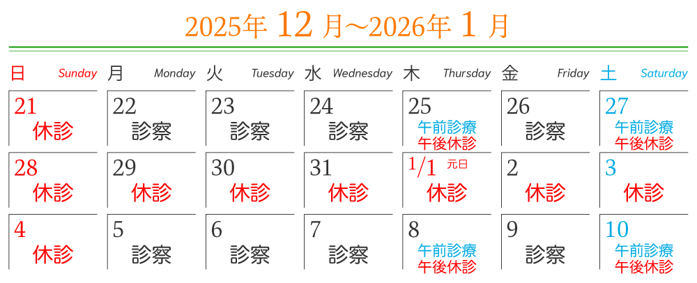 年末年始休診のお知らせ 公開済み: 2025-12-19更新: 2025-12-19作成者: 宮地クリニックカテゴリー: お知らせ 2025年12月29日(月)から2026年1月3日(土)まで年末年始の休診とさせていただきます。 1月5日(月)から通常診療いたします。 ご不便をおかけいたしますが、よろしくお願いいたします。
